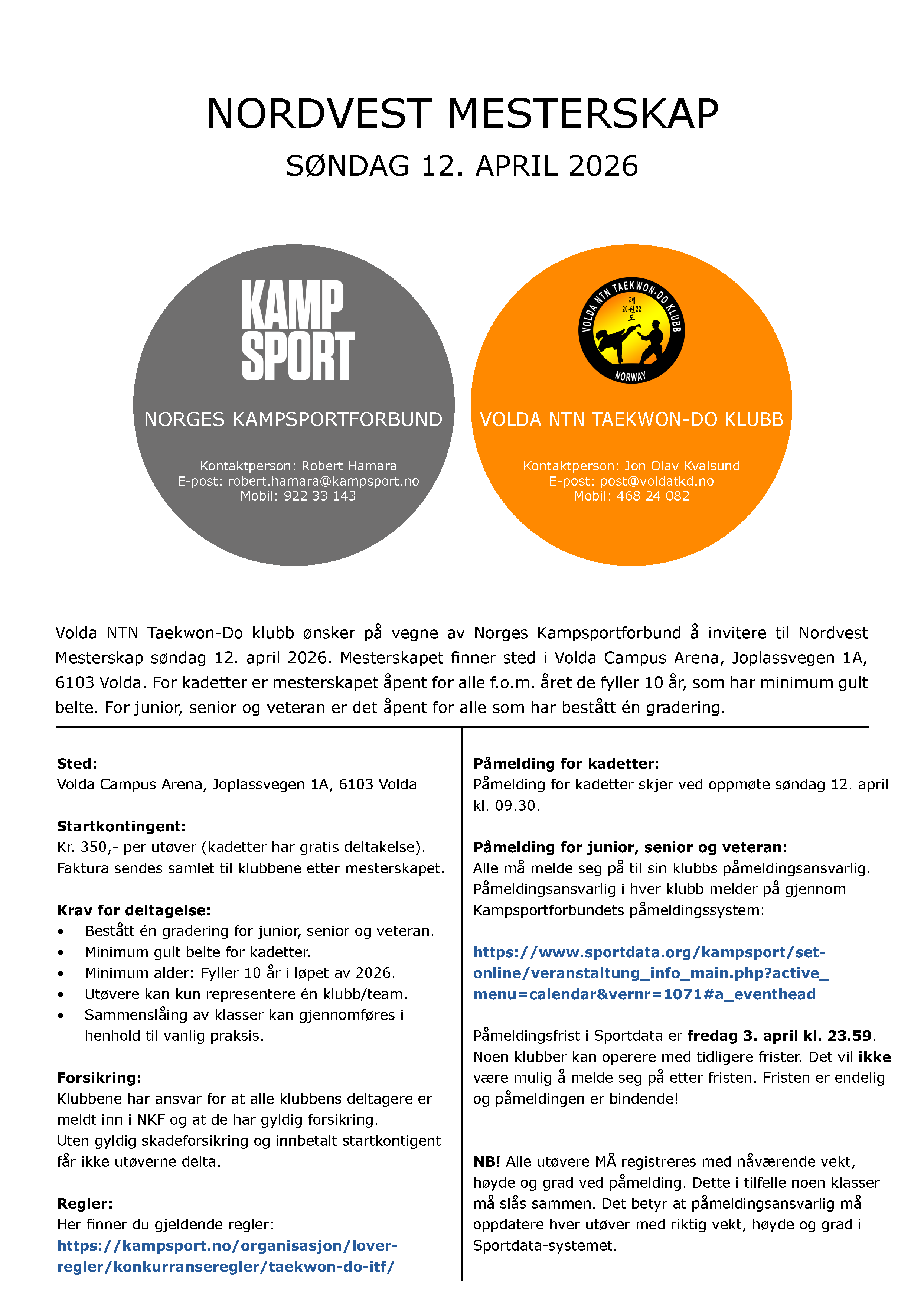 Søndag 12. april 2026 arrangeres Nordvest Mesterskap og kadettmesterskap i Volda Campus Arena.